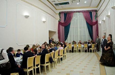 В счастливом единении поют… Во время проведения обряда имянаречения новоиспеченным родителям рассказывают об их обязанностях, о значении и происхождении имени ребенка, а также вручают верительную грамоту и свидетельство о рождении. Классическая музыка и уютный интерьер создают атмосферу праздника, особую торжественность и трогательность момента. В день открытия, 15 октября, на эту церемонию была приглашена многодетная семья Каримовых, у которых в июне родились трое замечательных малышей – два мальчика и девочка. Удивительно, но трехмесячные малыши даже ни разу не заплакали и с удовольствием фотографировались со всеми гостями праздника.