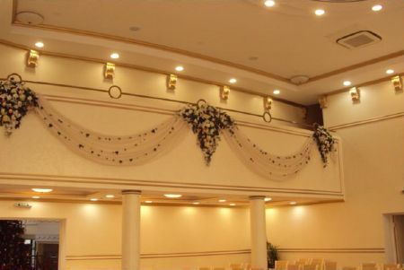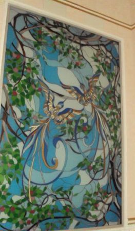 Большой популярностью у молодоженов пользуется банкетный зал. С целью создания гармоничного и изысканного интерьера, дизайнеры украсили стены зала художественными витражами с изображением райских птиц счастья. Игра света с тенью, свойственная декорированному витражному стеклу, создает особое настроение праздника.