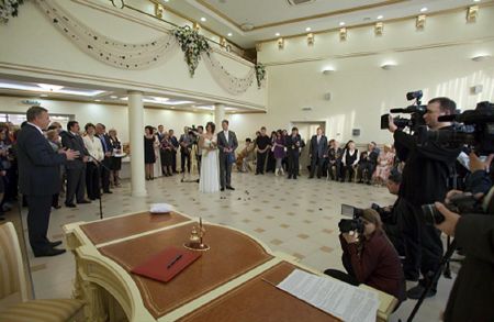Во Дворце торжеств одновременно работают два зала для торжественной регистрации брака, малый и большой.
