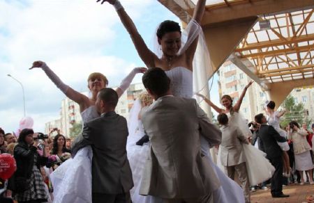 В преддверии Дня семьи, любви и верности МКУ «Дворец торжеств» и Управление ЗАГС подарили влюбленным города уникальную возможность стать участниками одного из самых красивых праздников – массовой регистрации заключения браков, которая состоялась 7 июля 2012 года.