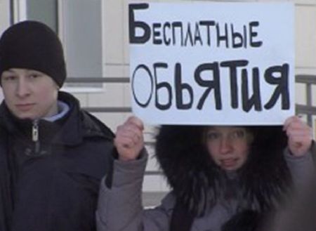 и приглашали на второй этап флеш-моба – «Массовые объятия», который состоялся у центрального входа Дворца торжеств под залпы праздничного фейерверка.